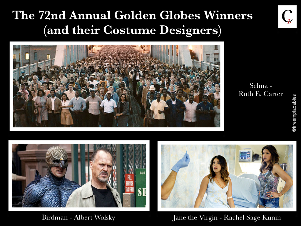 Moments destacats, com sempre el meu estimat Ricky Gervais dient coses del tipus “La gent famosa està per sobre de la llei” (tots els presents van deixar anar una riallada sense pudor, clar). George Clooney va afegir com sempre la nota solemne de l’esdeveniment, apel·lant a la unitat entre les religions després de l’atemptat contra la seu de Charlie Hebdo… Jo penso que la gent amb poder hauria de pressionar als governs i treballar més en el dia a dia per disminuir aquesta ona de xenofòbia que cada vegada és major, i no tan sols dir una frase indicada en un moment precís.
