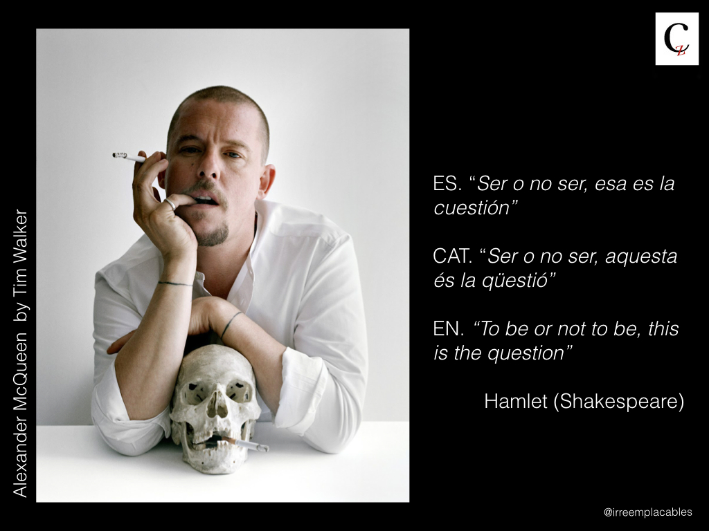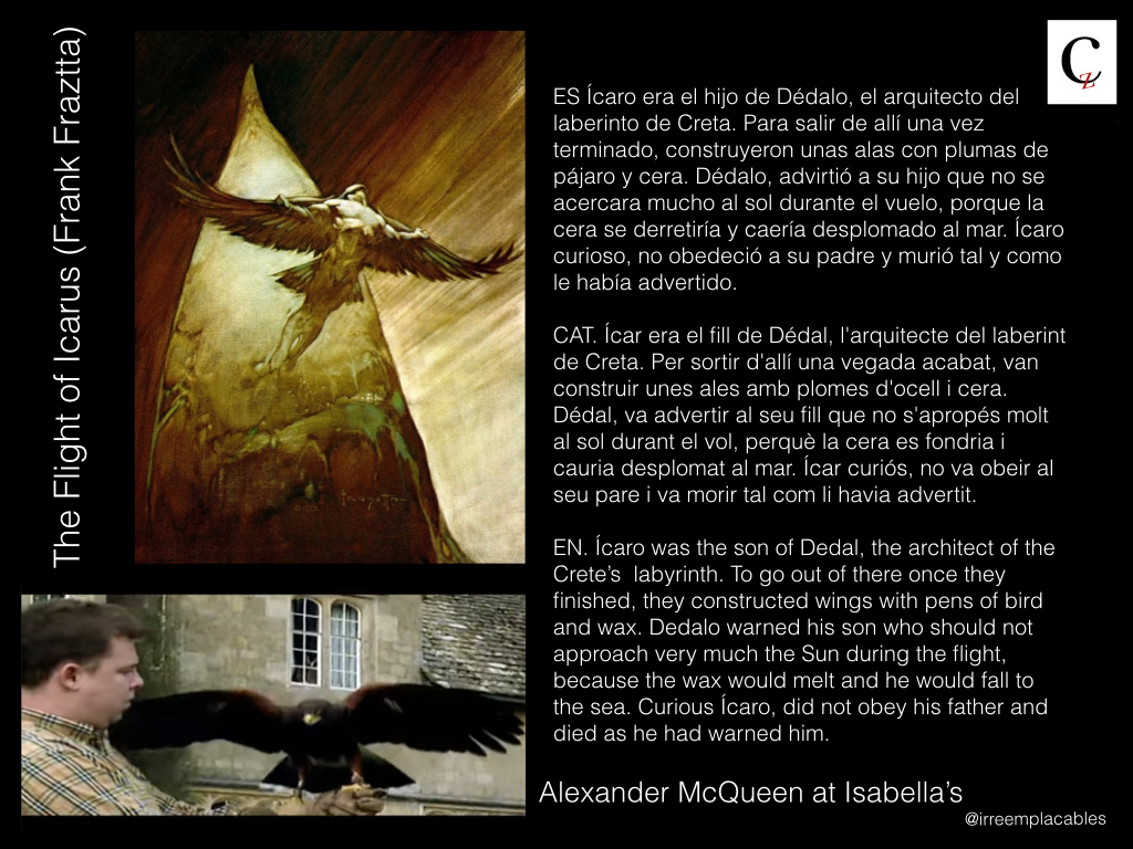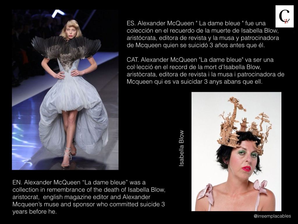 Sabía desde niña que sería algo en el mundo de la moda, pero mi padre tenía otro proyecto para mí, el de finalizar su propia obra: cuán egoístas son los progenitores que no conformes con una vida engendran otra para terminar la suya propia. Y aunque era más evidente que el fin del progreso con los Juicios de Salem, nadie prestó suficiente atención, yo no me oía y el taxi aparcado en la puerta de casa no me llevó a tiempo a las puertas de la Central Saint Martins College para que Bobby Hillson me propusiera entrar en su escuela. Llena de ira y de partenalización de estado, le guiñé un ojo a Tiresias e incliné mi vuelo hacia la derecha con todas sus consecuencias. ¡Alexander, Alexander, despierta! ¡No me puedo mover! Me has atrapado con tu latex. Voy a tener que abrirme paso a golpe de tocado, de cuernos y gorguera y no dudaré en usar tu propia violencia, la misma que me desnuda por falta de recursos y exceso de gusto, propio de las herederas.